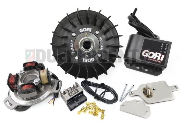 Accensione Elettronica Variabile "GORI PULSAR" 12V Cono Grande. L’accensione GORI PULSAR (CONO PICCOLO) ottimizza le prestazioni del motore e garantisce grande affidabilità grazie allo statore verniciato con una resina speciale resistente alle alte temperature che lo isola dal calore prodotto dal motore. Maggiore inerzia (aumento e ridistribuzione del peso periferico), peso volano 1,8Kg, Scintilla candela ad alto voltaggio grazie alla centralina con bobina maggiorata. Ventola in Nylon con nuovo profilo delle alette di raffreddamento. Maggiore affidabilità grazie al rotore ricavato dal pieno con funzionamento senza pick-up e centralina elettronica potenziata. Voltaggio e potenza, 12V / 95W.