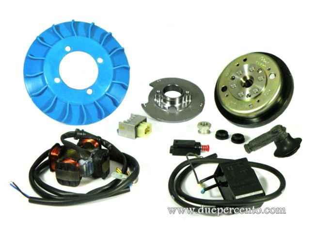 La nuova accensione analogica per motori Piaggio Vespa 50/125, è stata progettata per dare prestazioni superiori pur mantenendo l'utilizzo delle luci e utilizza un volano dal peso di 1,2 Kg. questo permette al motore di avere più accelerazione. Anticipo 23 gradi a 3.500 giri. L'accensione ANALOGICA comprende: statore a quattro poli, volano (peso 1,2kg) con inerzia modificata e ventola di raffreddamento. E' destinata all'impiego agonistico e prevede il funzionamento delle luci a 12 volt (questa modifica comporta la sostituzione delle lampade originali). Assicura maggiore ripresa, spunto, allungo e accelerazione. QUESTI COMPONENTI SONO DESTINATI SOLO AD USO AGONISTICO-SPORTIVO.
