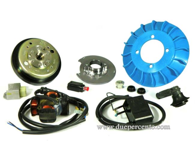 La nuova accensione analogica per motori Piaggio Vespa 50/125, è stata progettata per dare prestazioni superiori pur mantenendo l'utilizzo delle luci e utilizza un volano dal peso di 1,2 Kg. questo permette al motore di avere più accelerazione. Anticipo 23 gradi a 3.500 giri.