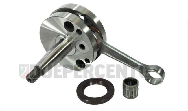Nuovo albero motore racing con volani di diametro 87,5 lato pignone, 83,5 lato volano, biella ricavata dal pieno per una maggiore performance, per carter Piaggio, si montano senza barenare i carter. Peso 1500 g. - Made in Italy
