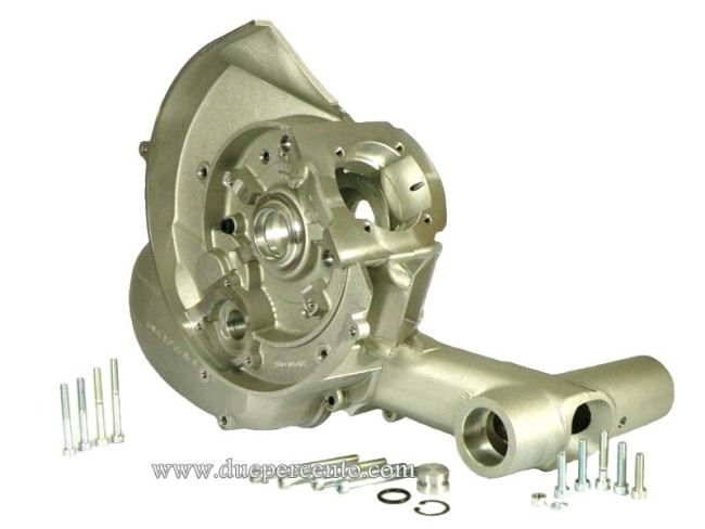 Carter per Vespa Special, Et3 e PK interamente fusi e lavorati in Italia. Sono rinforzati nello spessore in ogni sua parte, realizzati in conchiglia con materiale Galsi9 temprato e assemblaggio con 13 viti brugola da 6mm. Per questi carter è necessario l’utilizzo di alberi motore specifici, di dimensioni differenti da quelli per carter piaggio. Sono stati progettati per ospitare alberi motore con spalle fino ad 87mm senza bisogno di barenare ulteriormente. L’imbocco del cilindro è anch’esso più largo (65mm al posto di 62) per ospitare cilindri con camice larghe (m1l-60, m1L-R53 ecc). Dal lato volano sono lavorati in modo da ospitare anche l'accensione Vespatronik e nella parte superiore sono predisposti per il montaggio di marmitte che girano dietro all'ammortizzatore (tipo M3XC, Tipo R o simili).