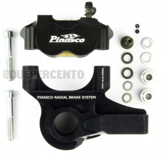 le pinze freno radiali Pinasco dispongono di una pinza con 4 pistoncini che aumentano notevolmente la frenata del veicolo. Questo rende la guida più stabile e sicura. Pinza NERA / Supporto NERO