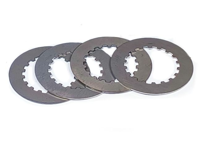 Dischi in acciaio per frizioni VMC 10 molle e per le frizioni che utilizzano pignoni modello "Piaggio COSA". Il kit comprende: nr. 1 disco spessore 2 mm + nr. 3 dischi spessore 1.5 mm. Realizzati in acciaio speciale e tagliati al laser per avere l'abbinamento perfetto tra le dentature del pignone e dei dischi. Sono qualitativamente superiori a tutti i dischi in acciaio in commercio realizzati da tranciatura