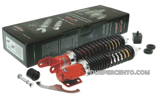 Gli ammortizzatori Carbone si fondono armoniosamente in un cocktail di prodotti di alta qualità, al 100% made in Italy. Il favorevole rapporto qualità / prezzo del KIT ammortizzatori rende il prodotto estremamente richiesto da restauratori, officine ed appassionati amanti dell’incredibile veicolo che divenne l’icona per eccellenza della mobilità a due ruote che caratterizzò la storia d’Italia del dopoguerra. - ATTENZIONE: Questo prodotto è destinato ad un uso specifico per competizioni su pista. La circolazione su strade aperte al traffico è quindi severamente vietata ed perseguita per legge dal Codice della Strada.