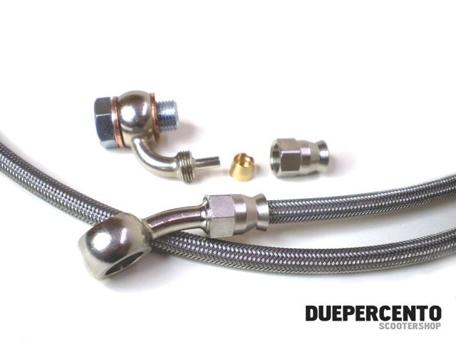 Tubo in treccia aeronautica per impianti idraulici. Il kit comprende - 1 tubo l=1400 mm, Ø 6,2 mm - 1 vite esagonale - 2 rondelle di rame - 1 raccordo inclinato a 10° montato sul tubo - 1 raccordo inclinato a 90° con bullone olio M10x1 da montare. Prima di avvitare il raccordo tagliare a misura il tubo.
