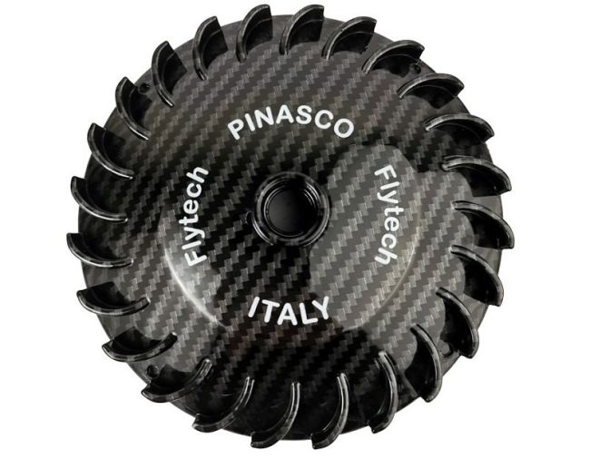 Volano Pinasco per Piaggio Moped (Ciao, Si, Bravo, Boxer, Grillo) con accensione elettronica. Il volano superleggero di 650 gr. circa presenta il classico rivestimento superficiale in Nylon caricato, l'anima del volano è in alluminio con anello di rinforzo in acciaio. Rispetto alla versione precedente il campo magnetico è generato da 4 magneti speciali in ferrite, sono state inserite 6 viti coniche di sicurezza sul perimetro per evitare la dilatazione della plastica causata dalla forza centrifuga. Viene rivestito e verniciato con effetto “Carbon Look” per riproporre un prodotto storico in chiave moderna e migliorata.